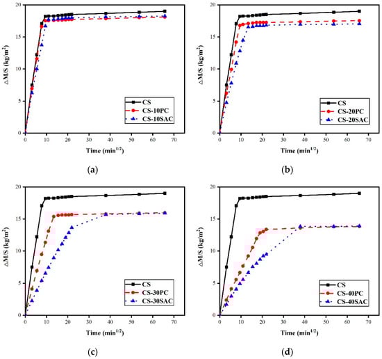 Curves of water absorption by capillarity of blended mortars at 28 days: (a) Blended mortars containing 10% cement; (b) blended mortars containing 20% cement; (c) blended mortars containing 30% cement; (d) blended mortars containing 40% cement.