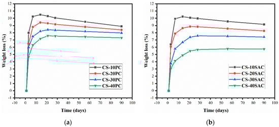 Weight loss of blended mortars: (a) CS-PC blended mortars; (b) CS-SAC blended mortars.