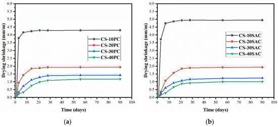 Drying shrinkage of blended mortars: (a) CS-PC blended mortars; (b) CS-SAC blended mortars.