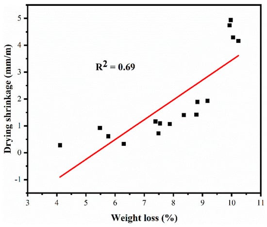 The reduction of moisture in capillary pore results in the change volume of blended mortars, and weight loss can reflects the reduction of moisture in capillary pore in a way. The weight loss has a positive correlation to drying shrinkage (R2 = 0.69), see Figure 8. Therefore, the reduction of weight loss caused by increasing cement content in blended mortars is beneficial to reduce shrinkage.