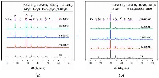 XRD patterns of blended pastes at 28 days: (a) CS-PC blended pastes; (b) CS-SAC blended pastes.