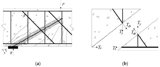 Shear failure and diagonal crack reinforcement internal force: (a) shear compression failure; and (b) schematic diagram of steel bars at the diagonal crack.
