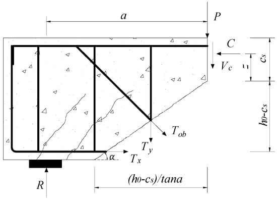 where h0 is the effective height of beam; is the depth of compression zone; c is the height of the compression zone; is an angle between critical diagonal crack and main reinforcement; and is an angle between the diagonal steel bar and the stirrup.