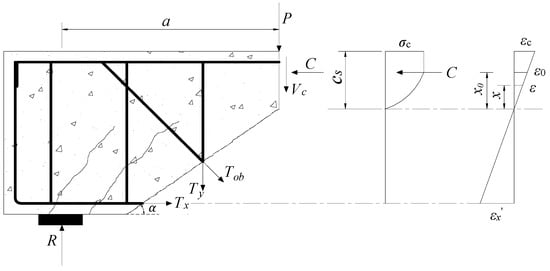 Figure 4 shows the schematic diagram of the shear strength model. The stress is assumed to be linearly distributed along the height of the shear-compression zone. According to the assumption of plane section, the horizontal concrete strain ε at any point within cs range of the height of the shear-compression zone of critical diagonal crack is calculated by