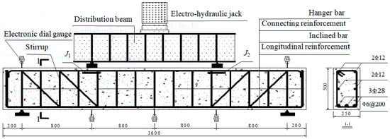 Fourteen members were manufactured for assessing the influence of corrosion in stirrups and inclined bars on shear performance. The beam had a cross section of 250 mm × 500 mm. The length of beam was 3600 mm. Hot rolled reinforcements were used in these specimens. The diameters () of longitudinal, hanger and inclined bars were 28, 12 and 12 mm, respectively. All three types of reinforcing bars were HRB335 deformed rebar. The stirrups were double-legged plain bar (HPB235) with 6 mm diameter and 200 mm spacing. Figure 5 shows the dimension and reinforcement of these test specimens. The material properties of reinforcements are shown in Table 1.