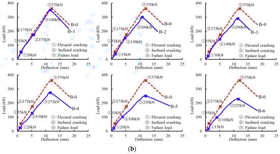 The applied loads corresponding to the occurrence of different types of cracks were also recorded. Figure 6 presents the loads corresponding to flexural cracking, inclined cracking and failure. As can be seen, the load data of the control beam are shown above the curves; the load data of these deteriorated members are listed blow the curves. The diagonal cracking strength of beams in Group B decreased significantly. One of these diagonal cracks extended to the loading point and gradually developed into the critical diagonal crack. These crack morphologies of test members are shown in Figure 7. The test specimens in the two groups presented the same failure mode. Due to the corrosion in different steel bars, the two groups exhibited little difference in the deterioration process. Specimens A-4–A-6 with severe corrosion showed the fracture of stirrups. The corrosion level in Group B was larger than that of Group A, and fracture of both the stirrups and inclined reinforcements were found. In addition, the reinforcement corrosion in Group B led to a change of the inclination angle of the critical diagonal crack, which differed from Group A. For beam B-0 and corroded beams B-1–B-3, the inclination angle of critical diagonal crack was small, which propagated to a loading location. The severely corroded beams B-4–B-6 had a larger inclination angle of the critical diagonal crack.