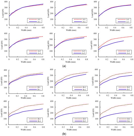 Load–maximum diagonal crack width curves: (a) Group A; and (b) Group B.