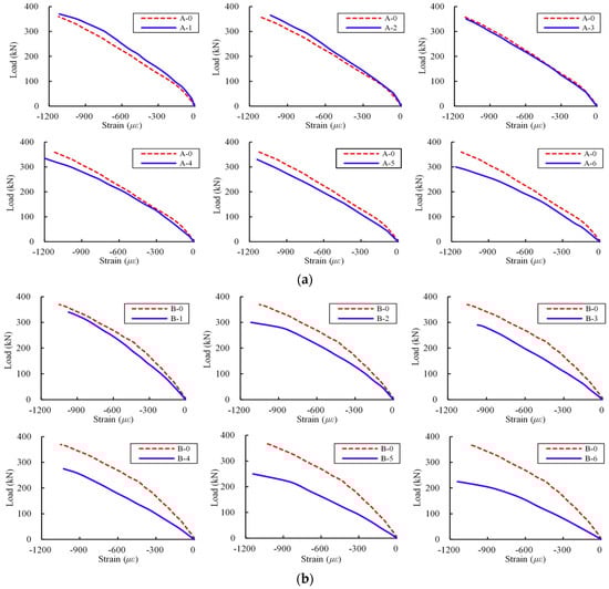 Load–strain curves in shear-bending section of concrete: (a) Group A; and (b) Group B.