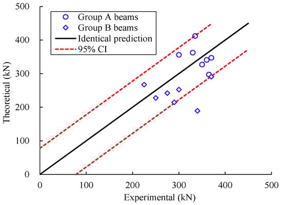 Figure 10 shows a comparison between the predictions and the test observations. x-axis and y-axis represent the experimental results and the theoretical results, respectively. A 95% confidence interval (CI) of the predicted value is also given (see the dashed lines). As can be seen, most of the theoretical values were close to the test observations and 92.9% of the data fell within this confidence interval. The mean of the ratio of the predicted values to the observation value was 0.93. The standard deviation was 0.18. Few test points were outside the 95% confidence bounds. The points with large deviations were mainly for the beams with small strain in the concrete compression zone, especially for beams B-1 and B-3, which may be attributed to the effects of test environment and strain gauge on the measurement of the concrete strain.