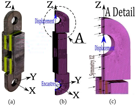 (a) Specimen mounted on the steel sheets designed for the shear test. (b) Proposed parameterized symmetric finite element (FE) model. (c) Details of the proposed FE model in which the nodes of the upper hole in which displacement was imposed are visible.