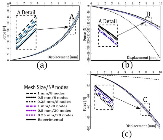 where YEXP are the forces that were obtained experimentally for a value of displacements k, and YFEM are those forces that were obtained from the FE simulations for the corresponding values of displacement k and m is the number of force-displacement values that were used to make the adjustment. Table 1 shows that, as the size of the elements decreased and when the proposed FE models had a quadratic formulation (20 nodes), the computational cost increased for all standardized tests that were conducted. The table also shows that, as the size of the elements decreased, the MAE also decreased for both FE models with a linear and quadratic formulation. The smallest MAEs obtained were for mesh sizes of 0.25 mm and quadratic formulation.