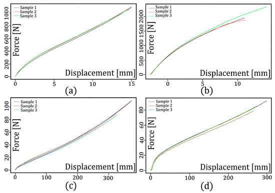 (a) Shear test for the nitrile butadiene rubber (NBR) material, (b) shear test for the polyurethane (PUR) material, (c) tensile test for the NBR material, and (d) tensile test for the PUR material.