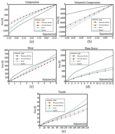 Force-displacement curve obtained from the FE simulations when the optimal constants Ci are compared to the force-displacement obtained experimentally for the hyper-elastic Mooney–Rivlin model for NBR material in standardized tests (a) compression, (b) volumetric compression, (c) shear, (d) plane stress, and (e) tensile.