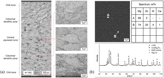 (a) Microstructure of the TRC (twin roll cast) state ZAX210 [25], divided into three characteristic sections through thickness cross-section and (b) scanning electron micrograph, results of the XRD analysis (X-ray diffraction) and chemical composition of structural constituents according to marking in SEM (scanning electron microscope) image determined via EDX analysis (energy dispersive X-ray spectroscopy) for the ZAX210 in TRC condition [30].