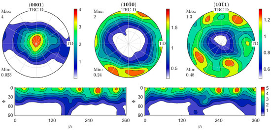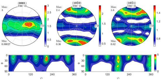 (0001)-basal, -prismatic and -pyramidal pole figures related to the TRC direction and transverse direction of the TRC strips denoted as TRC D and TD (transverse direction) respectively as well as calculated ODF sections at φ2 = 0° and 30°.