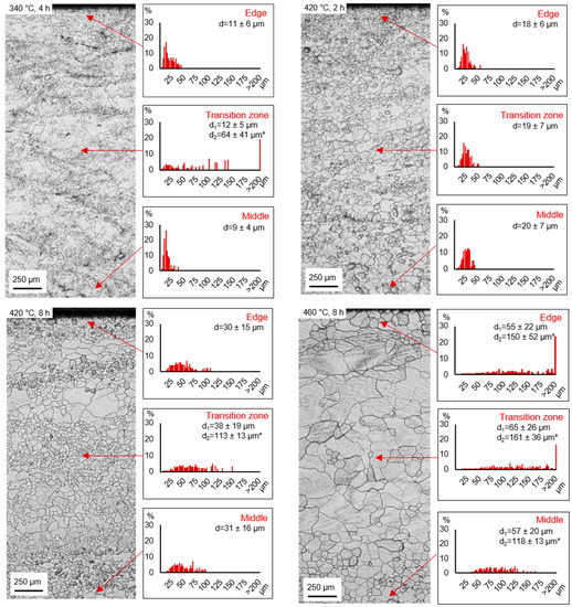 Microstructures of the annealed ZAX210 alloy with regard to the heat treatment conditions (340 °C, 4 h; 420 °C, 2 h; 420 °C, 8 h and 460 °C, 8 h) and associating grain size distribution depending on the characteristic section of the TRC strip (edge, transition zone and middle); diagrams show grain size class vs. percentage of the grain area in relation to the total area of all measured grains (→ TRC direction, * two maxima due to bimodal grain size distribution).