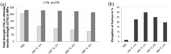 Mechanical properties at room temperature of the ZAX210 alloy after twin roll casting and different heat treatments: (a) yield strength and ultimate tensile strength and (b) elongation at fracture.