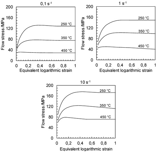 Exemplary flow curves during plane strain compression at temperatures of 250 °C, 350 °C and 450 °C as well as strain rates of 0.1 s−1, 1 s−1 and 10 s−1 are shown in Figure 6. The flow curves exhibit smooth hardening and softening phases, while the maximum flow stress value moves–together with the strain rate increase–towards greater equivalent logarithmic strain values. The flow stresses decrease when the strain rate is decreased or the temperature is increased. The flow stress initially increases because of strain hardening and reaches a peak value, subsequently decreasing with further strain. The course of the flow curves indicate that dynamic recrystallization occurs. The rates of strain hardening and strain softening vary with the deformation conditions. The initial hardening is associated with the increase in dislocation density. At lower strain rates, dislocation multiplication is less rapid and contributes to a lower strain hardening effect than that at higher strain rates. Deformation at higher temperatures or at lower strain rates result in higher dynamic recrystallization kinetics because of higher diffusivity at higher temperatures and more time for nucleation and growth of dynamically recrystallized grains.