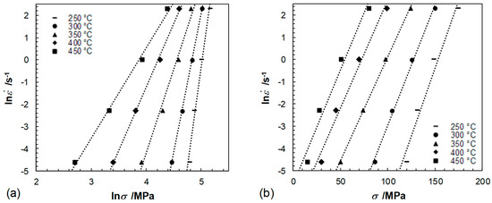 where is the strain rate (s−1), A is the material constant, n is the stress exponent, α is a fitting parameter, σ is the peak stress (MPa), Q is the average activation energy for plastic flow (kJ/mol), R is the gas constant (8.314 J/(mol·K)) and T is the thermodynamic deformation temperature (K). The parameters of this equation were obtained from the mean values of the slopes of graphs relating flow stress to strain rate and temperature in linear dependence, see Figure 7, Figure 8 and Figure 9, and are as follows: , α = , Q = 180.5 kJ/mol. The calculated model coefficients have validity for temperatures ranging from 250 °C to 450 °C as well as for equivalent logarithmic strain rates of 0.01 s−1 to 10 s−1. The activation energy Q indicating deformation difficulty degree during hot deformation depends on concurrent dynamic precipitate, dislocation pinning effects and the second phase. The high Q value (higher than that for lattice diffusion of magnesium, which is 135 kJ/mol) might be attributed to the existence of precipitates and the fine microstructure. Precipitates could hinder dislocation movement during the deformation and exerted a resistant force for lattice self-diffusion. Additionally, the fine grains provide more grain boundaries acting as barriers to the dislocation movement and lattice self-diffusion. Besides, the addition of alloying elements presumably have an effect on the activation energy, due to the effect of solution strengthening.