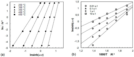 Relationship between (a) ln−ln[sinh(ασ)] at different temperatures and (b) ln[sinh(ασ)]−1/T as a function of the tested strain rates.