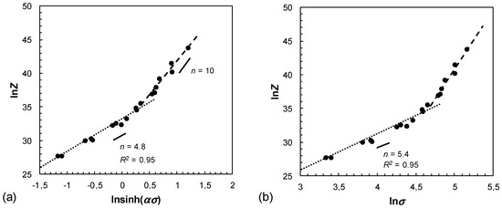 As is well known, the Zener–Hollomon parameter Z is determined by Z = ·exp(Q/(RT)). The dependence of lnZ to is shown in Figure 9. The interpretation of the power law relationship depends on the fitting of the relationship between the Zener–Hollomon parameter and . At low Z values linear regression was determined to an accuracy of (R2) = 0.95, revealing a good fit of the hyperbolic sine function. Following the constitutive equation