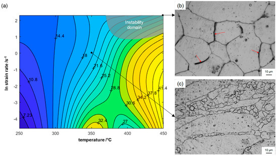 (a) Processing map for TRC and annealed ZAX210 at an equivalent logarithmic strain of 0.4 and (b) microstructure within the instability domain (450 °C; 10 s−1) and (c) resulting microstructure in stable domain (350 °C; 1 s−1).