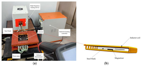 An induction coil of a high-frequency inductor was composed of six parallel copper tubes with a spacing of 10 mm to form a flat solenoid. The steel blanks were placed in an internal rectangular space, which was formed by the upper and lower copper tubes and was about 130 mm in length, 200 mm in width, and 15 mm in height. Two kinds of induction heating experiments were carried out through the inductor. The first one was uniform induction heating, and the second experiment was localized induction heating, which was based on the first one. In detail, the dimensions are shown in Table 2. Because the dimension and shape of the magnetizer may have different effects on the temperature field of the steel blank, they will be investigated in a following study. Therefore, this paper only studies the localized heating with a certain size of magnetizer piece as an example.