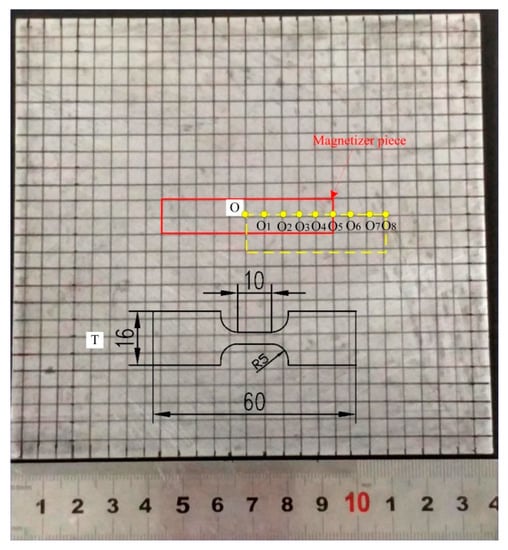 Sample position in the quenched blank. (The red frame: The projection position of the magnetizer piece; O1–O8 on yellow frame: Metallographic sampling points location; O and T: Tensile specimen size and location).