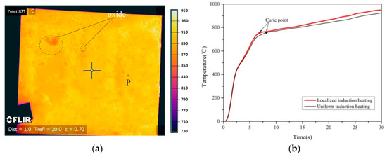 A uniform temperature field of the steel blank was induced and the temperature reached 925 °C (Figure 3). The two curves in Figure 3b feature two heating intervals at different heating rates. The inflexion point corresponds to the Curie temperature (TC = 760 °C), which will rise with the increasing heating rate [13]. Moreover, the rate of the localized heating is higher than that of the uniform heating, arrives at TC earlier, and has a higher ultimate temperature (950 °C). The reason is attributed to the effect of the magnetizer piece, which will be clearly explained later. After reaching Tc, the heating rate decreases and is nearly constant for two experiments with values ranging from 7.5 to 8.3 K·s−1. This is because, due to the magnetic properties of steel, the heating rate cannot be further raised once the material is paramagnetic [14]. However, the oxide is unevenly distributed on the surface of the uncoated steel blank and the small oxide points are sporadically distributed on the blank, which suggest the oxide may noticeably affect the judgment of temperature distribution of the blank.