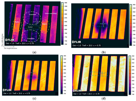 The reason for this phenomenon is attributed to the shielding effect of the magnetizer on the eddy currents induced in the steel blank. The magnetic flux preferentially passed through the magnetizer, due to its higher magnetic permeability, instead of the steel blank which was right above the magnetizer. As a result, the eddy currents induced in this zone were reduced, forming a lower-temperature region. Although the lower-temperature region was obvious, its shape did not exactly match the dimension of the magnetizer piece. The purple dark area partially exceeded the magnetizer width and was named the transition region. Meanwhile, the neighborhood close to both ends of the magnetizer along its length direction was under noticeably higher temperature than at the body of the steel blank and can be named the higher-temperature region. Another region occupying a large proportion on the steel blank was unaffected by the magnetizer and called the high-temperature region. In detail, the positions of different temperature regions are schematically shown in Figure 4a as an example.