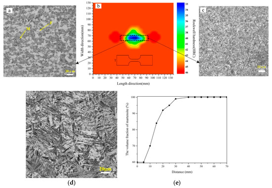 The typical microstructure image from the lower-temperature regions shows the mixture microstructure consists of ferrite and martensite, whereas the high-temperature region (over 900 °C) is converted to lath martensite after water quenching. The martensite average grain size is less than 10 µm, which is favorable for mechanical properties. Furthermore, on the basis of sampled OM images and the blank center as the origin, the volume fraction of martensite related to distance in the horizontal positive direction as an example was determined on ImageJ. As the distance was prolonged, the temperature gradually rose from the minimum of 820 °C at the center of the lower-temperature region to the maximum of 950 °C (Figure 4d), which means the proportion of austenite and the volume fraction of martensite after quenching also increased with the rise of temperature (Figure 5e).