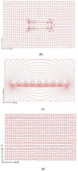 As revealed in the X–Y plane from Figure 6b, due to the sparseness of the magnetic flux lines right below the magnetizer and the attraction of the magnetizer width section in the Y direction, the nearby magnetic flux lines bent toward it, where the magnetic flux density was small. Consequently, the transition region was formed.