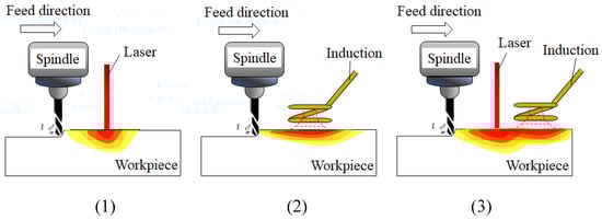 The schematic diagram of thermally assisted machining with (1) Laser assisted milling, (2) Induction assisted milling, and (3) Laser-induction assisted milling.