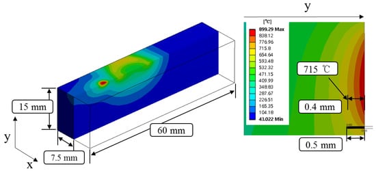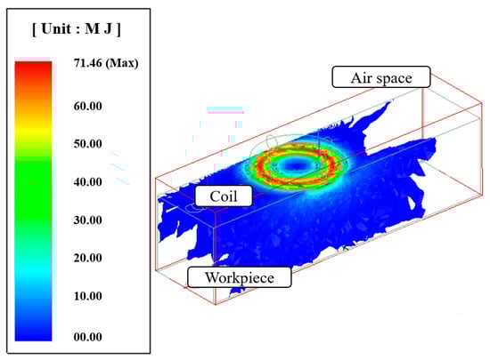 Before performing the electromagnetic-thermal coupled analysis, an electromagnetic analysis of the induction heat source using the Maxwell program was performed. When preheating using an induction heat source, the heat energy is transferred to the workpiece via eddy currents. As a high frequency alternating current flows through the coil, a lot of eddy currents are induced in the workpiece. The induction heating analysis model consists of a coil for electromagnetic induction, a workpiece, and air space. The diameter of the induction coil was 10 mm. As a boundary condition for the electromagnetic analysis, a high frequency current of 300 kHz was applied, and the current flow was applied to a section of the heating coil.