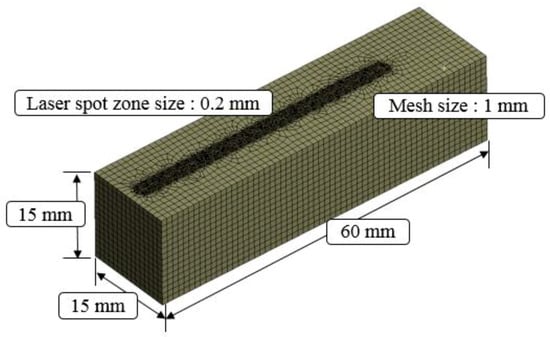 Figure 2 shows the current distribution in the workpiece. The analysis results of the induction heat source were transferred to the ANSYS workbench program and an electromagnetic-thermal coupled analysis was performed. Mesh generation and boundary conditions were set to perform the analysis of the laser-induction heat sources. The hex dominant method was applied to the mesh generation for thermal analysis. The mesh size was divided by 0.2 mm on the upper surface in the laser spot zone and 1 mm on the rest of the workpiece except for the laser spot zone. The number of elements and nodes in the analysis model was 69,681 and 203,045, respectively. The distance between the laser and induction heat source was set at 3 mm. Figure 3 shows the analysis model for the laser-induction electromagnetic-thermal coupled analysis. The specific heat and thermal conductivity of the two materials were obtained from previous studies, as shown as Table 1 and Table 2 [15,28], because the thermal analysis using a single heat source from laser and induction was performed in previous studies [29,30]. Heat flow is given sequentially to heat source geometry according to the feed rate by the overlap along the tool path.