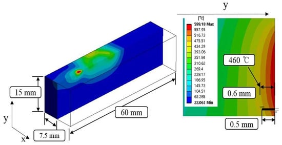 Figure 14 shows the maximum temperature of the thermal analysis and the experimental values according to measurement depth in the Ti-6Al-4V. When the depth of the workpiece was 0.1 mm, 0.5 mm, 1 mm, and 2 mm, the error between the thermal analysis and experimental values was 8.5%, 2.5%, 3.5%, and 8.8%, respectively. Within 1 mm of the actual cutting depth, the error between the thermal analysis and experiment results was within 3.5%, and the error increased as the depth became deeper than 1 mm.