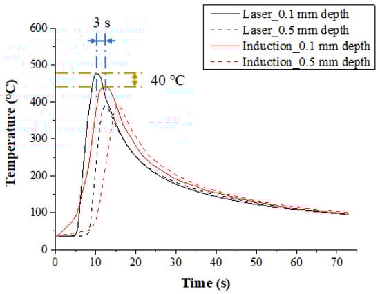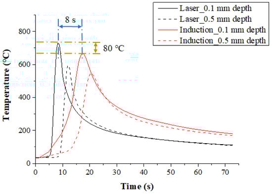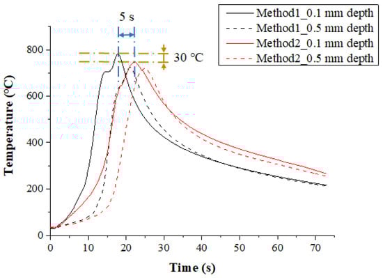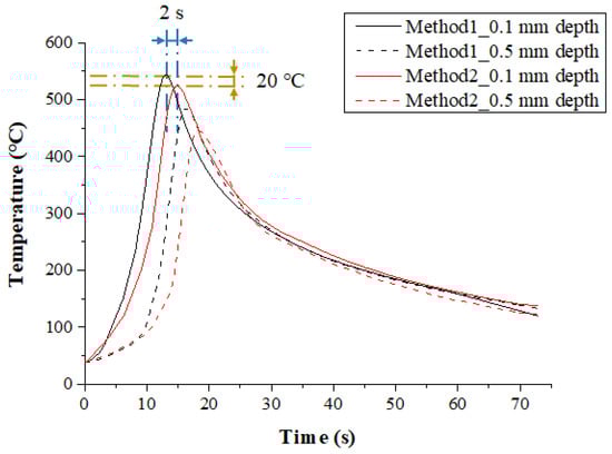 Figure 11 shows the measured temperature at depths of 0.1 mm and 0.5 mm from the surface of Ti-6Al-4V according to the multi preheating methods of laser-induction. The preheating effect was similar for both methods because the set temperature was not high. However, the maximum temperature of Method 1 with laser as the main heat source was 20 °C and 40 °C higher than Method 2 at the depths of 0.1 mm and 0.5 mm from workpiece surface, respectively.