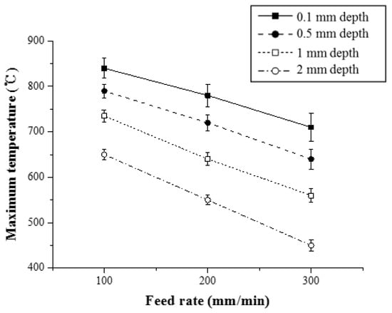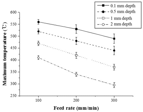 In order to analyze the thermal effect of the multi heat sources, Figure 9 shows the maximum temperature with respect to the feed rate for Inconel 718 (Method 1). As the feed rate of the heat source increased, the preheating effect of the workpiece decreased. When the feed rate was increased from 100 to 200 mm/min and from 200 to 300 mm/min, the maximum temperature at a depth of 0.1 mm from the workpiece surface was reduced by 7% and 10.1%, respectively. At a depth of 0.5 mm, the maximum temperature was reduced by 9.8% and 11%, respectively. When the workpiece was irradiated with the same preheating temperature, the preheating effect was reduced because the heat input absorbed by the material decreased as the feed rate increased.