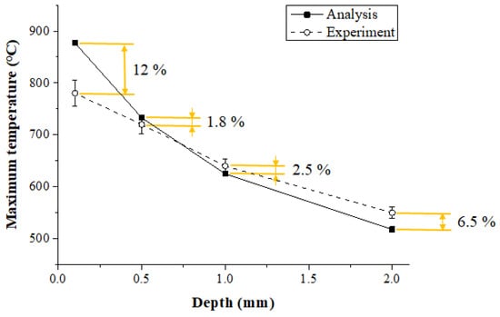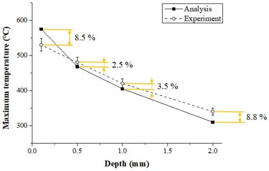Figure 13 shows the maximum temperature in the thermal analysis and experimental values according to the measurement depth of Inconel 718. When the depth of the workpiece was 0.1 mm, 0.5 mm, 1 mm, and 2 mm, the error between the thermal analysis and experimental values was 12%, 1.8%, 2.5%, and 6.5%, respectively. When the depth was between 0.5 and 1 mm, the error was within approximately 2.5%, and the analysis results were similar to the measured experimental values. The error in the results increased with the surface area of the workpiece and the error increased as the depth became deeper than 1 mm. The surface temperature set in the thermal analysis was 900 °C, but the preheating effect produced by actual temperature control was reduced as the feed rate increased.