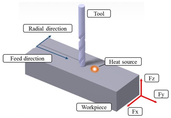 Bermingham et al. [10] studied laser assisted milling strategies with different cutting tool paths and verified their effectiveness with the computer aided manufacturing (CAM) program. Lee et al. studied the cutting forces and surface roughness of the workpiece when processing three-dimensional shapes, such as ellipses and cylinders, using various machining methods [11,12]. Wiedenmann et al. proposed a new machining strategy using laser assisted milling and verified the effectiveness by measuring cutting force and material removal rate [13]. Wang et al. studied the coated tool wear characteristics of nickel alloys using laser assisted milling [14]. Kim et al. proposed a prediction equation for the cutting force and preheating temperature of Inconel 718 and AISI 1045 steel using laser assisted milling [15]. Lee et al. conducted machining tests using eco-friendly machining methods, such as MQL, cryogenic, and LAM for titanium alloys. They compared the tool wear, cutting force, and power consumption for each machining method using experimental results [16]. Shin et al. used thermal and mechanical modeling analysis to investigate the machining characteristics of difficult-to-cut materials using laser assisted side cutting [17].