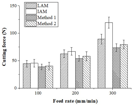 The machining of Inconel 718 was carried out and the cutting forces were measured using a tool dynamometer. Figure 16 shows the measured cutting forces according to the four types of heat sources. The cutting force was selected as the resultant force of the feed direction cutting force (Fx) and the radial direction cutting force (Fy). Because the DOC was constant during machining, the average values of Fx and Fy were used. The cutting force according to the feed rate of the heat source was lowest in the laser-induction assisted milling, using induction as an auxiliary heat source. At a feed rate of 100 mm/min, the cutting force of LAM was 44.72 N, the cutting force of IAM was 62.65 N, the cutting force of Method 1 was 38.83 N, and the cutting force of Method 2 was 40.31 N. The cutting force of Method 1 was reduced by approximately 15%, 16%, and 4% compared to LAM, IAM, and Method 2, respectively. At a feed rate of 200 mm/min, the cutting force of LAM was 62.64 N, the cutting force of IAM was 67.08 N, the cutting force of Method 1 was 54.08 N, and the cutting force of Method 2 was 58.31 N. The cutting force of Method 1 was reduced by about 16%, 24%, and 8% compared to LAM, IAM, and Method 2, respectively. At a feed rate of 300 mm/min, cutting force of LAM was 89.44 N, cutting force of IAM was 67.08N, cutting force of Method 1 was 54.08 N and cutting force of Method 2 was 79.612 N. The cutting force was reduced by about 21%, 62%, and 8%, respectively.