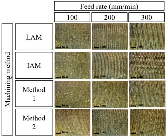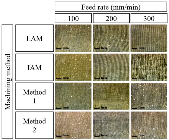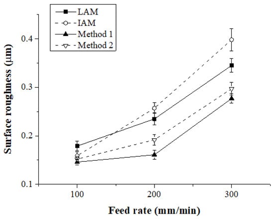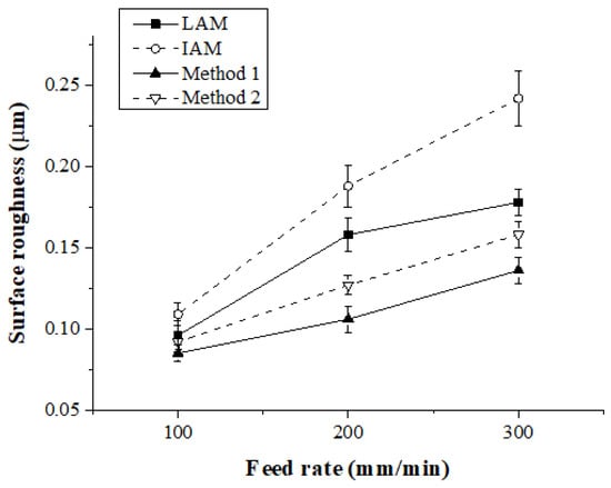 Figure 20 shows the surface roughness according to the feed rate for each heat source type. When the feed rate was 100 mm/min, the surface roughness of IAM, Method 1, and Method 2 were similar, and the surface roughness of LAM was approximately 13% higher than other heat sources. At a feed rate of 200 mm/min, the surface roughness of Method 1 compared to LAM, IAM, and Method 2 was improved by about 31%, 37%, and 16%, respectively, and at a feed rate of 300 mm/min, the surface roughness was improved approximately 19%, 30%, and 6%, respectively.