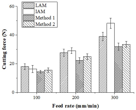 The machining of Ti-6Al-4V was carried out by TAM. Figure 19 and Table 6 show the measured cutting forces according to the four types of heat sources. At a feed rate of 100 mm/min, the cutting force of LAM was 18.03 N, the cutting force of IAM was 29.15 N, the cutting force of Method 1 was 22.36 N, and the cutting force of Method 2 was 15.62 N. The cutting force of Method 1 was decreased by approximately 25%, 14%, and 5% in comparison with LAM, IAM, and Method 2, respectively. At a feed rate of 200 mm/min, the cutting force of LAM was 27.80 N, the cutting force of IAM was 29.15 N, the cutting force of Method 1 was 22.36 N, and the cutting force of Method 2 was 25.00 N. The cutting force of Method 1 was reduced by about 24%, 30%, and 12% compared to LAM, IAM, and Method 2, respectively. At a feed rate of 300 mm/min, the cutting force of LAM was 39.05 N, the cutting force of IAM was 48.26N, the cutting force of Method 1 was 32.06 N, and the cutting force of Method 2 was 33.54 N. The cutting force of Method 1 was reduced by about 22%, 51%, and 5% compared to LAM, IAM, and Method 2, respectively. When the feed rate was 100 mm/min, the cutting force of the induction heat source was lower than that of the laser, indicating that induction can achieve a preheating effect similar to the laser when the feed is low. As the feed rate increases, the preheating effect of the multi heat sources increased more than the single heat source.