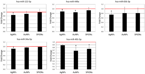 Expression of miRNAs down-regulated by AgNPs (10 µg/mL), AuNPs (10 µg/mL) or SPIONs (5 µg/mL) treatment for 6 h. Data are expressed as the mean ± standard deviation from three independent experiments. The red line shows the expression level in the control group. Asterisks denote a statistically significant difference versus the control group.