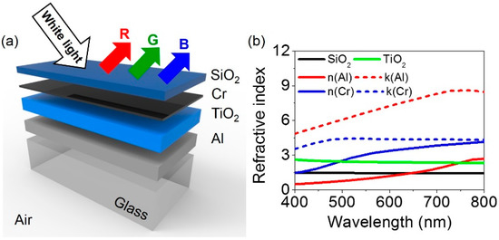 Figure 1a depicts the schematic diagram of the proposed broadband absorber-based highly efficient reflective structural color filters with angle-insensitive and polarization-independent performances. The cavity structure simply consists of a dielectric layer sandwiched by two different metallic layers with anti-reflective (AR) coatings atop in an asymmetric configuration. Titanium dioxide (TiO2) is a wide bandgap material whose optical absorption losses in the visible wavelength range are nearly negligible, which is used as a cavity medium. A change in the thickness of TiO2 leads to shifted resonances. Silicon dioxide (SiO2), which is a lossless dielectric material, is employed as the AR layer that mitigates the reflection at the top surface of the metallic mirror. Chromium (Cr) is used as a mirror with relatively constant and lower reflectivity, implying that it uniformly absorbs the visible range. Such optical absorptions of Cr are required to attain the broadband absorption property and thus reflective color generation with high efficiency. Aluminum (Al) is utilized for providing high reflections at a bottom surface. When employing lossy metals at the bottom of the structure, the resonance is too broad to create the colors. Effects of both top and bottom metallic layers on the spectral reflectance properties will be studied in the last section of this paper. It is also important to note that both Cr and Al feature low cost, abundant, high stability and good adhesion to numerous materials, thereby providing opportunities for practical applications. As optically thick metallic mirror is used at the bottom, either silicon (Si) or glass can be used for a substrate. Figure 1b presents measured complex refractive indices of the dielectric materials by using a spectroscopic ellipsometer (Elli-SE, Ellipso Technology Co.), which are used in the simulation. Refractive indices of Cr and Al are retrieved from Johnson and Christy [40]. Figure 2a–c presents 2D contour plots of optical absorptions as a function of the wavelength and the SiO2 thickness with fixed thicknesses of Cr and Al at 5 and 100 nm for blue, green and red colors, respectively, which are obtained by using the transfer matrix method. Those plots show the optimized thickness of the AR layer. Since an optically thick metal is used as a substrate, no light is transmitted through the entire structure, which implies that spectral reflectance properties are simply complementary spectra of the optical absorption profiles. In Figure 2a, it is found that the reflection spectrum for the blue color shows not only highly suppressed reflections (i.e., high absorptions) at resonances between 500 nm and 800 nm but high reflection efficiency (i.e., low absorptions) at off-resonance wavelengths between 400 nm and 500 nm along with a narrow bandwidth when choosing the thickness of around 80 nm for the AR coating. We note that capabilities of filtering a narrowband of desired wavelengths and suppressing other wavelengths are essential to achieve high color purity. Similarly, an 80 nm thick AR layer is found to be an adequate thickness for both green and red colors as well, as can be seen from Figure 2b,c. Figure 2d displays the 2D contour plot of optical absorptions as a function of the wavelength and the TiO2 thickness. With increasing the thickness of the spacer layer, a resonance (i.e., absorption peak) shifts toward a longer wavelength range and higher-order resonances appear at shorter wavelengths.