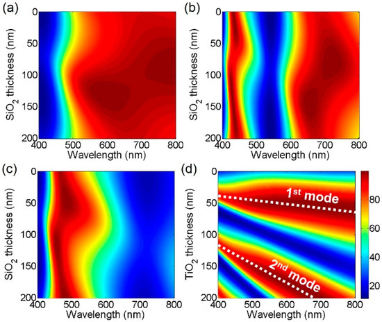 2D contour plots of optical absorptions as a function of a wavelength and a SiO2 layer thickness for (a) blue, (b) green and (c) red colors. (d) 2D contour map of absorptions as a function of a wavelength and a thickness of TiO2.