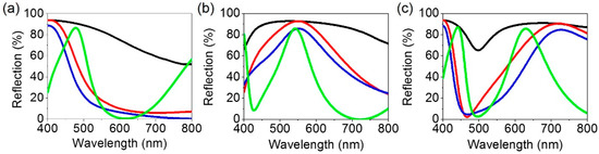 Simulated spectral reflectance curves at normal incidence for (a) blue, (b) green and (c) red colored structures. Black, red, blue and green solid lines represent the reflection spectrum obtained from the structures consisting of TiO2 (B: 65 nm, G: 100 nm, R: 140 nm)/Al (100 nm), Cr (5 nm)/TiO2 (B: 65 nm, G: 100 nm, R: 140 nm)/Al (100 nm), SiO2 (80 nm)/Cr (5 nm)/TiO2 (B: 65 nm, G: 100 nm, R: 140 nm)/Al (100 nm) and SiO2 (80 nm)/Cr (5 nm)/TiO2 (B: 180 nm, G: 210 nm, R: 250 nm)/Al (100 nm), respectively.