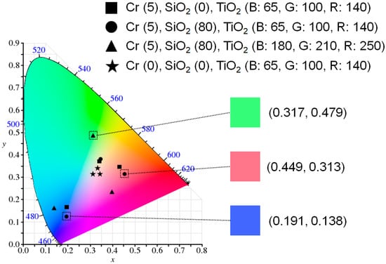 A representation of color coordinates calculated from the reflection spectra studied in Figure 3 illustrated on the CIE 1931 chromaticity diagram.