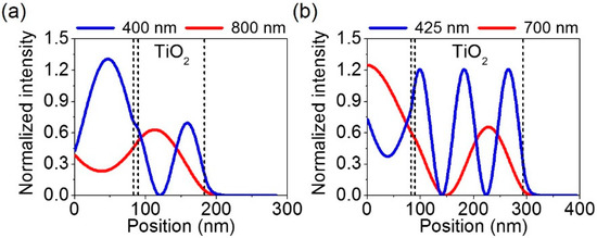 Normalized intensity distributions of electric field into the proposed structures where the thickness of TiO2 layer is (a) 100 nm and (b) 210 nm with fixed thicknesses of SiO2, Cr and Al at 80, 5 and 100 nm.