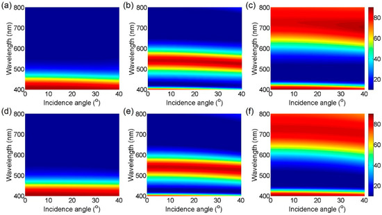 Simulated 2D contour plots of reflection as a function of a wavelength and an angle of incidence displaying that the reflection peaks are insensitive to incident angles up to 40° for (a–c) s- and (d–f) p-polarizations. The broad optical resonance effects result in both polarization-independent and angle-invariant characteristics. Red and blue colors represent high and low reflection efficiency in color maps.